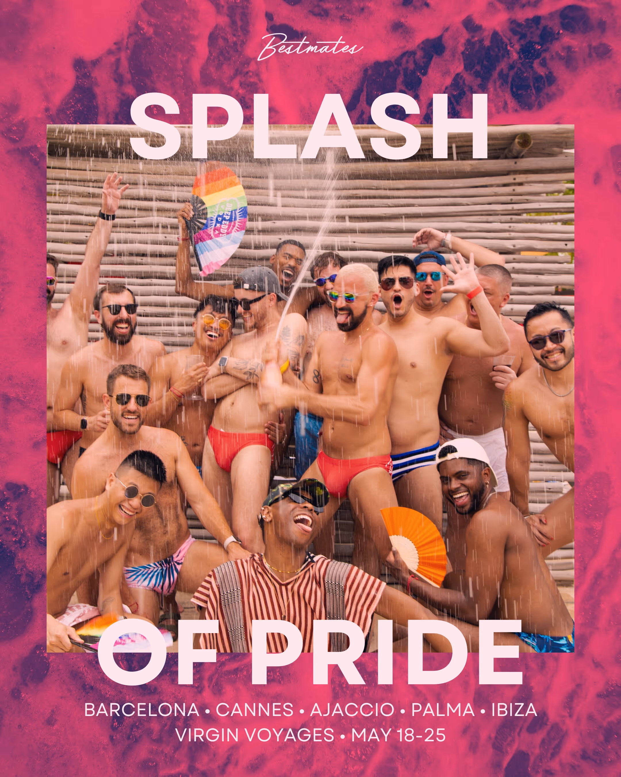 Splash of Pride is Bestmates' flagship group experience — LGBTQ+ group sailings on Virgin Voyages, produced annually. Rather than treating it as a sub-product, I developed it as a distinct sub-brand with its own visual identity, colorway, and campaign architecture.